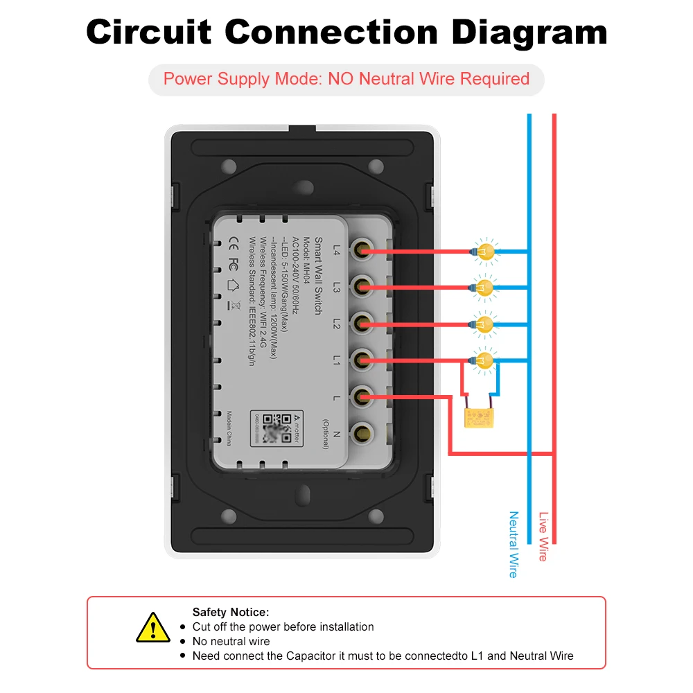 9.No neutral wire & with neutral wire:the switch support no neutral wire and with neutral wire.you can choose any of the installation methods.(Note:When you choose no neutral wire,capactior must be connected to L1)
