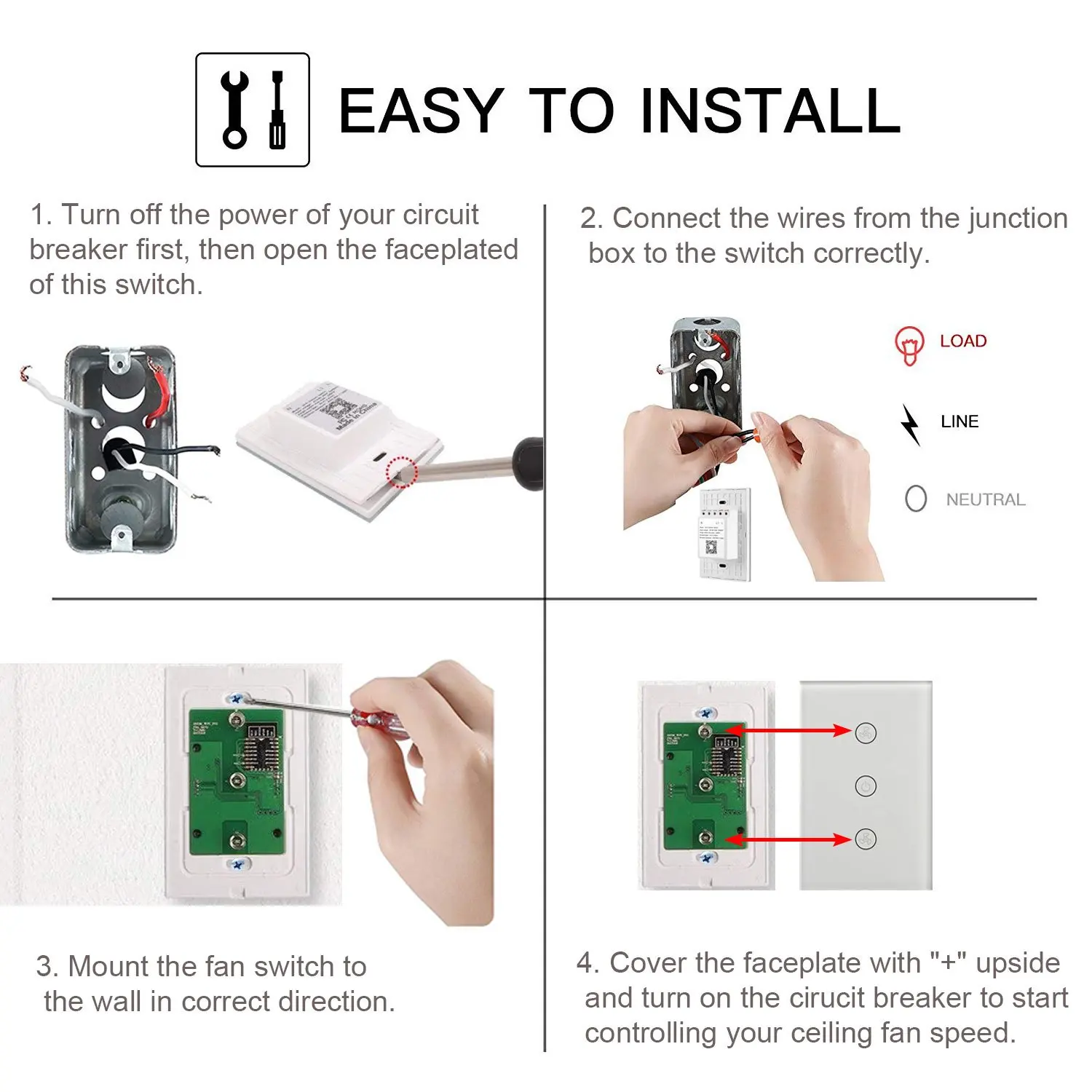 The Wi-Fi Smart Fan Switch uses your existing home Wi-Fi network to provide wireless control of your ceiling fan from anywhere, no hub required, it can easy replace the traditional switches directly, then you can start controlling your ceiling fan from your mobile phone by 'Smart Life' APP(ios or android).The Wi-Fi smart fan switch also a normal switch, simply touch the switch to toggle your ceiling fan on or off and the fan speed.