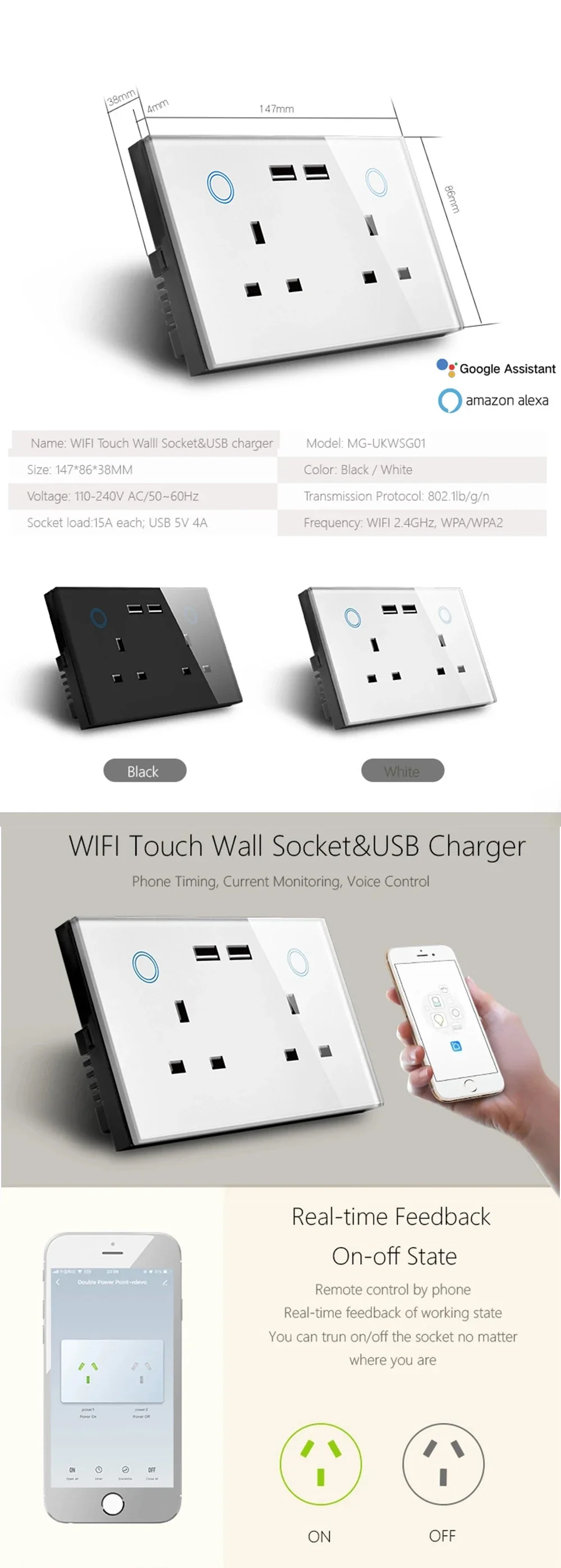 Smart WiFi Wall Socket with USB Socket Charger Smart Switch Outlet Plug Works with Amazon Alexa Echo, Google Assistant, Nest No Hub Required