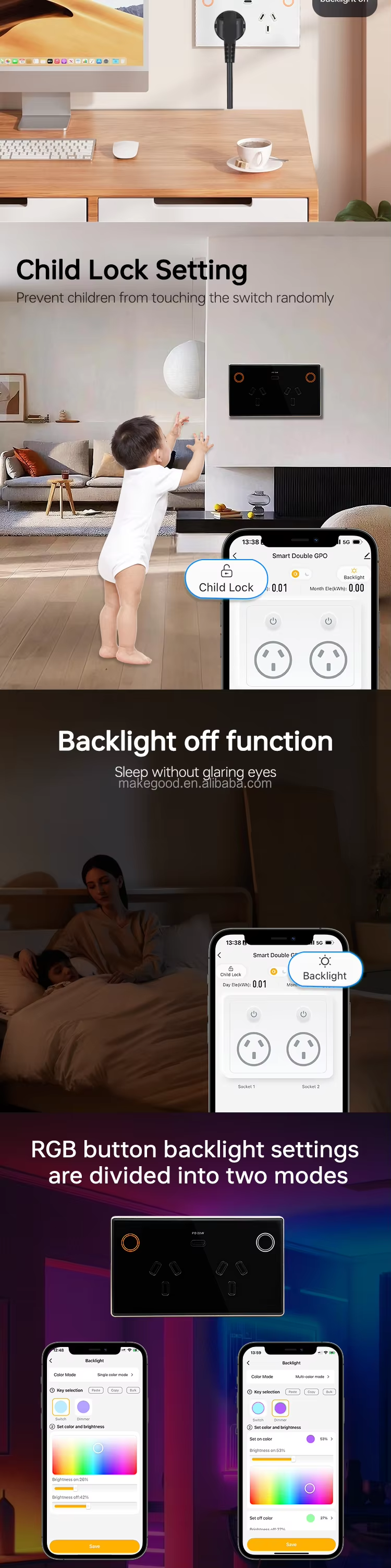 Dual Independent Outlets with Smart Scheduling: 2 AU standard grounded outlets (10A, 110V-250V AC), each controllable independently via the Tuya Smartlife APP. Set custom timers (one-time/daily/weekly cycles) or countdowns—schedule lamps to turn on at dusk, set fans to run for hours after leaving home, and adapt the smart function to your lifestyle for energy saving.