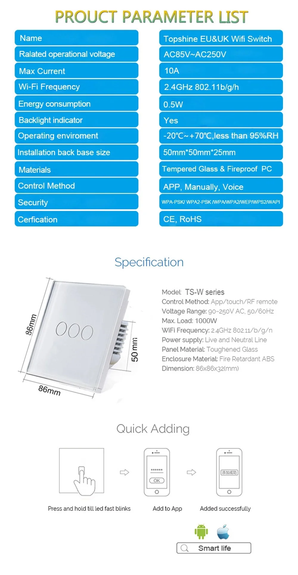 1 x Tuya Smart Touch Switch (1/2/3/4 Gang, choose according to your needs) 1 x Installation Manual