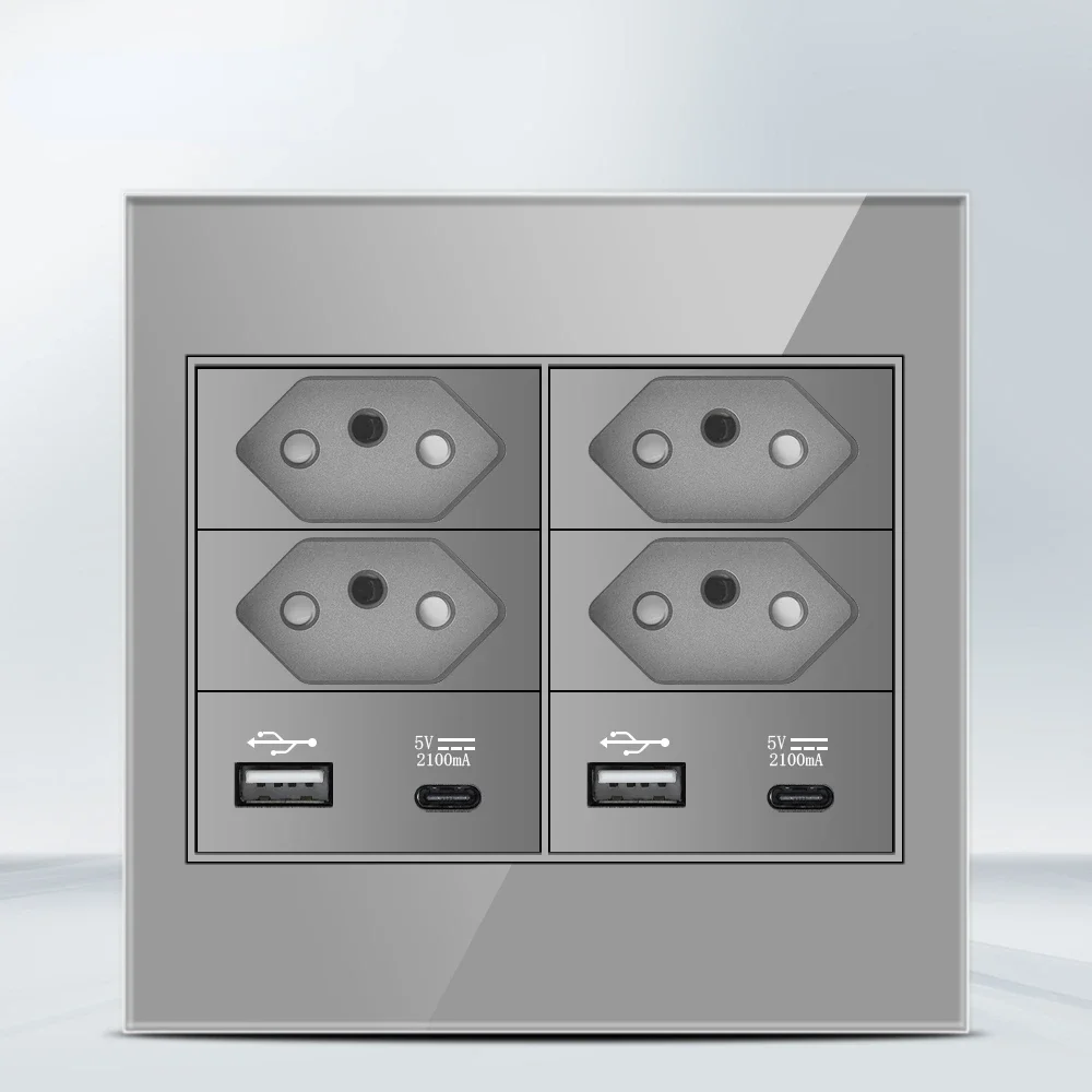 Melery 4x4 Fireproof Glass Panel Brazil Standard Outlet Double USB Type C 10/20W Wall Power Socket Light Switch Office Grey 20A