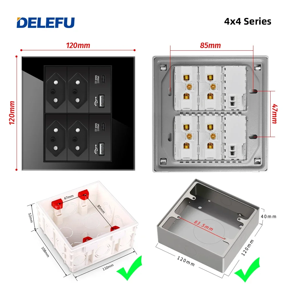 Melery 4x4 Fireproof Glass Panel Brazil Standard Outlet Double USB Type C Wall Power Socket Light Switch Office Black 10A 20A