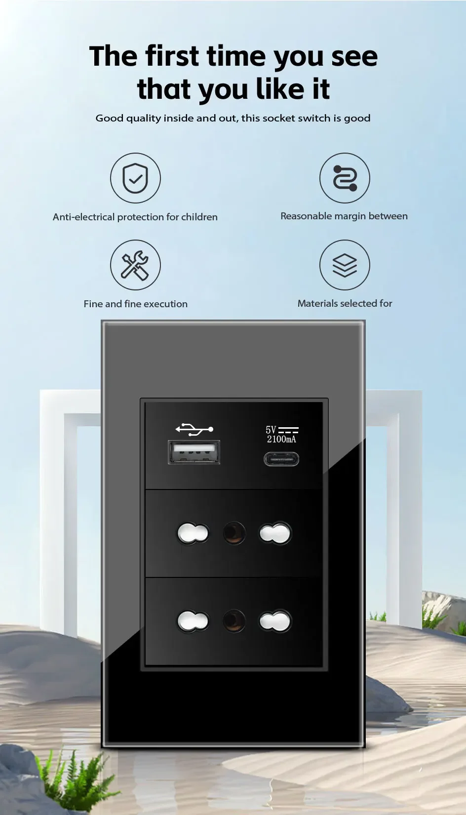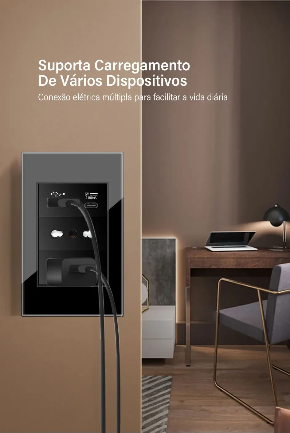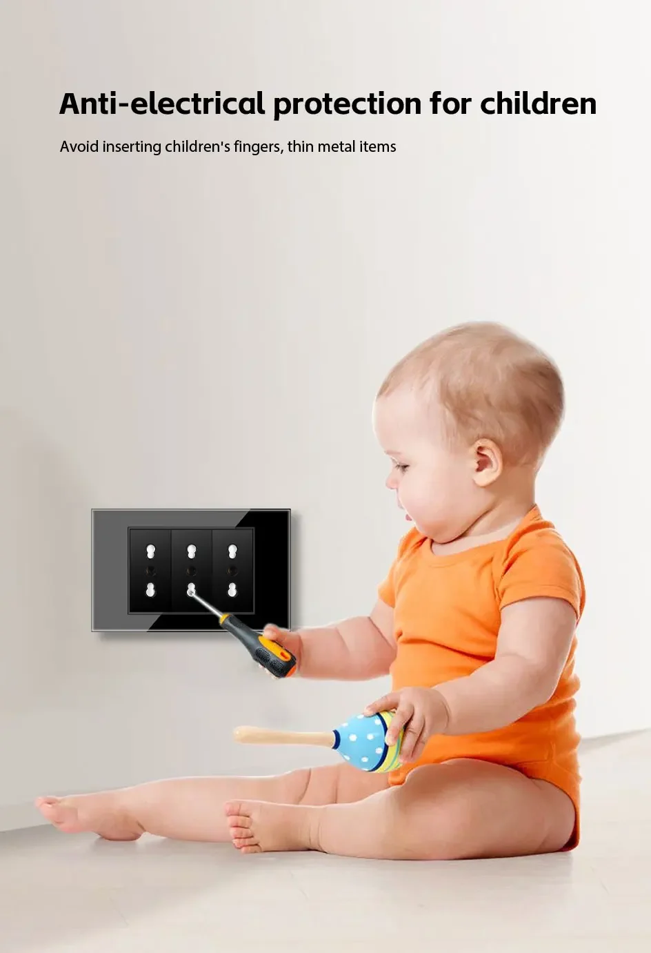 Melery Black Tempered Glass Italy Standard Home Office EU Outlet USb Type C Chile Korea Wall Socket Light Pressure Switch 118
