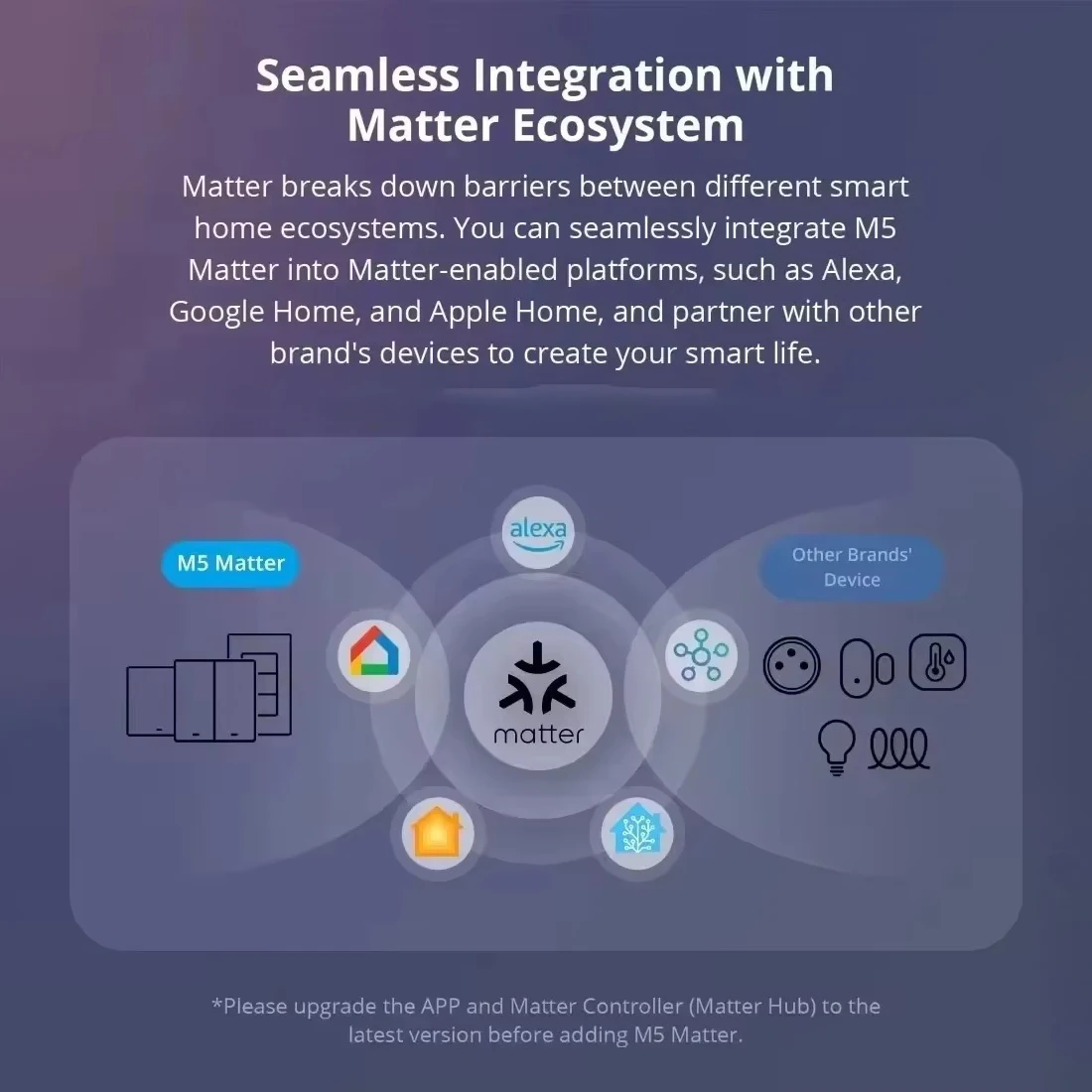 -With Matter, Skip the step of downloading and registering multiple manufacturers' apps every time you buy a new device. Instead, head straight to certified smart home platforms like Apple Home, Alexa, Google Home, SmartThings to control all your Matter devices.