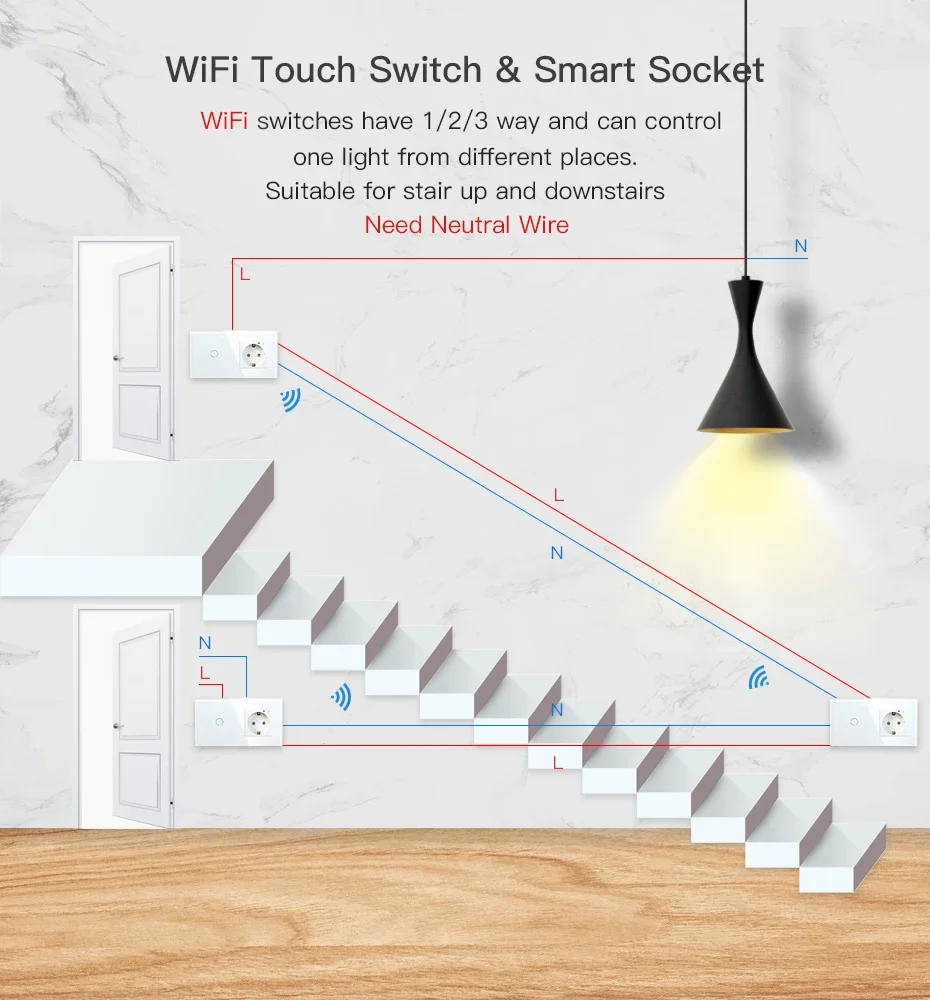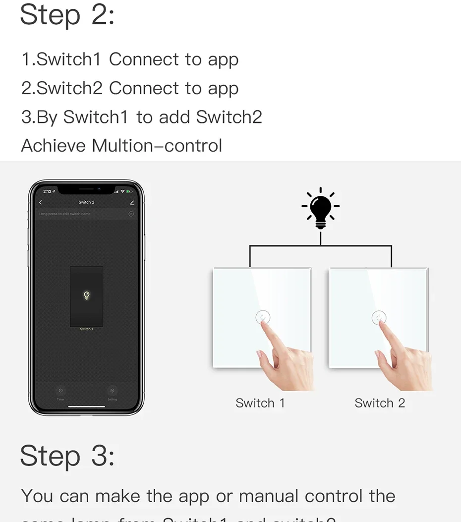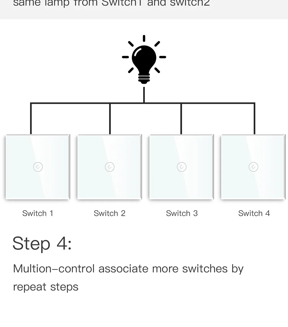 Multi-Control Association: wifi switches have 1/2/3/4way and can control one light from four Different places(the maximum is 4 way).