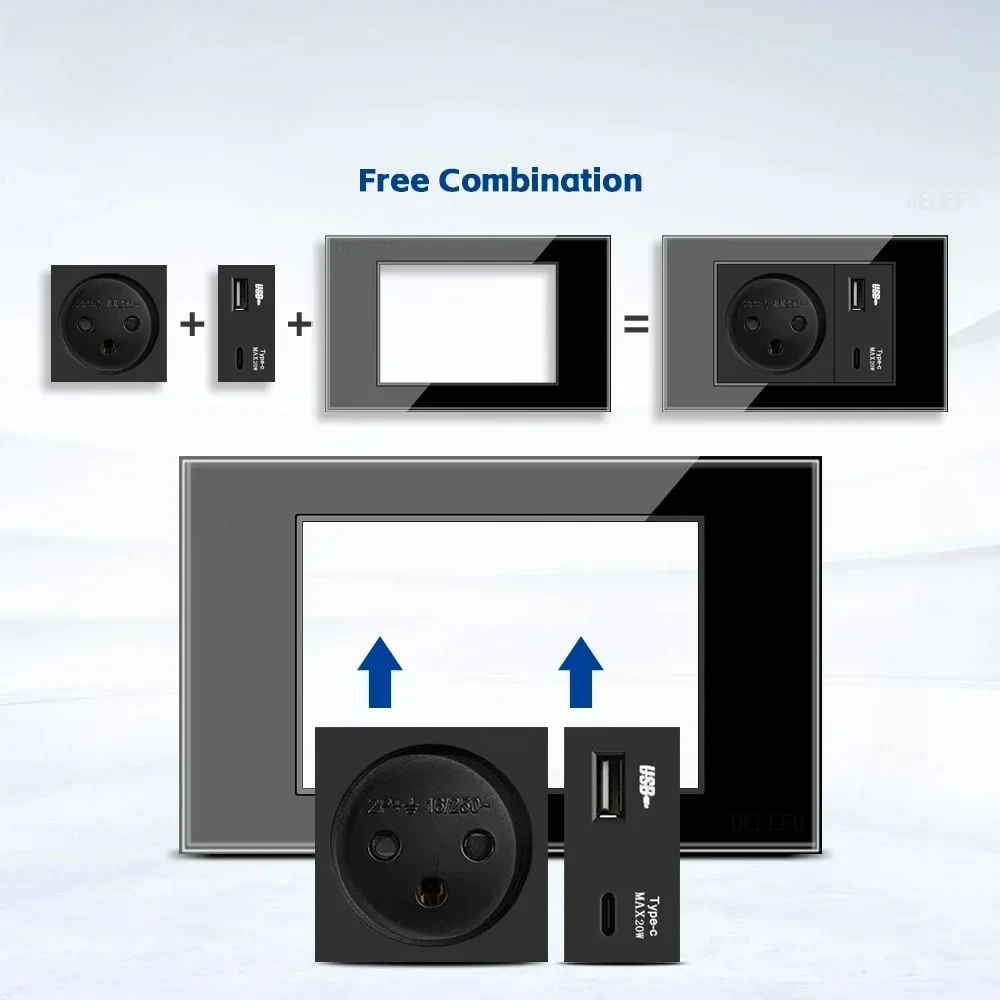 Melery Tempered Glass Israel Standard Wall Socket USB 20W Type C Fast Charging Satellite TV Tel CAT5 CAT6 Outlet Light Switch