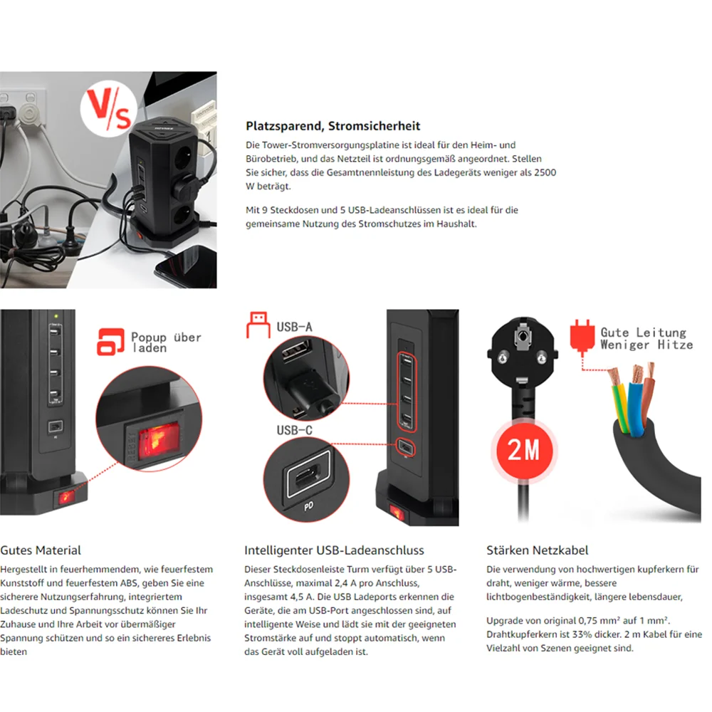 This power strip tower has 5 USB connections, a maximum of 2.4 A per connection, a total of 4.5 A. The USB charging ports detect the devices connected to the USB port in an intelligent way and charge them with the appropriate current and stops automatically when the device is fully charged.
