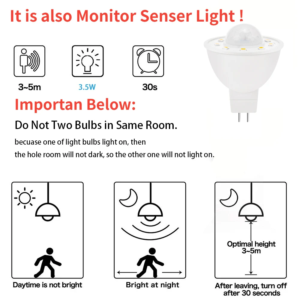 MR16 PIR Motion Sensor LED Light Bulbs, 3.5W, 50W Equivalent, 500lm, Day White /Warm White 3000K , LED Sensor light for Stairs Garage Corridor Walkway Hallway Carport, 2 Pack [Energy Class A+]