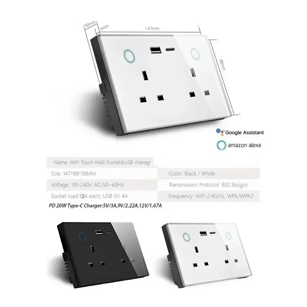 Smart WiFi Wall Socket with USB Socket Charger Smart Switch Outlet Plug Works with Amazon Alexa Echo, Google Assistant, Zigbee Hub Required