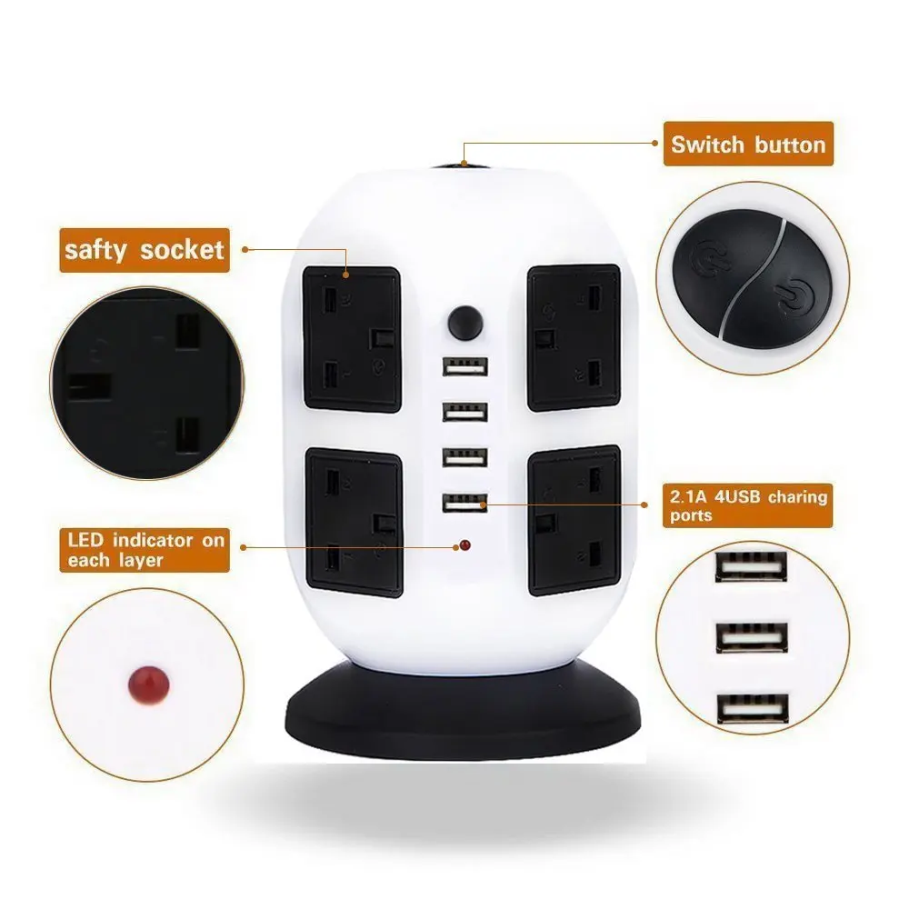 8 outlet + 4 USB ports + 3M extension cord. Ideal solution for small home appliances, general household. A perfect power strip charge for your cellphone, tablet, laptop and lamp simultaneously