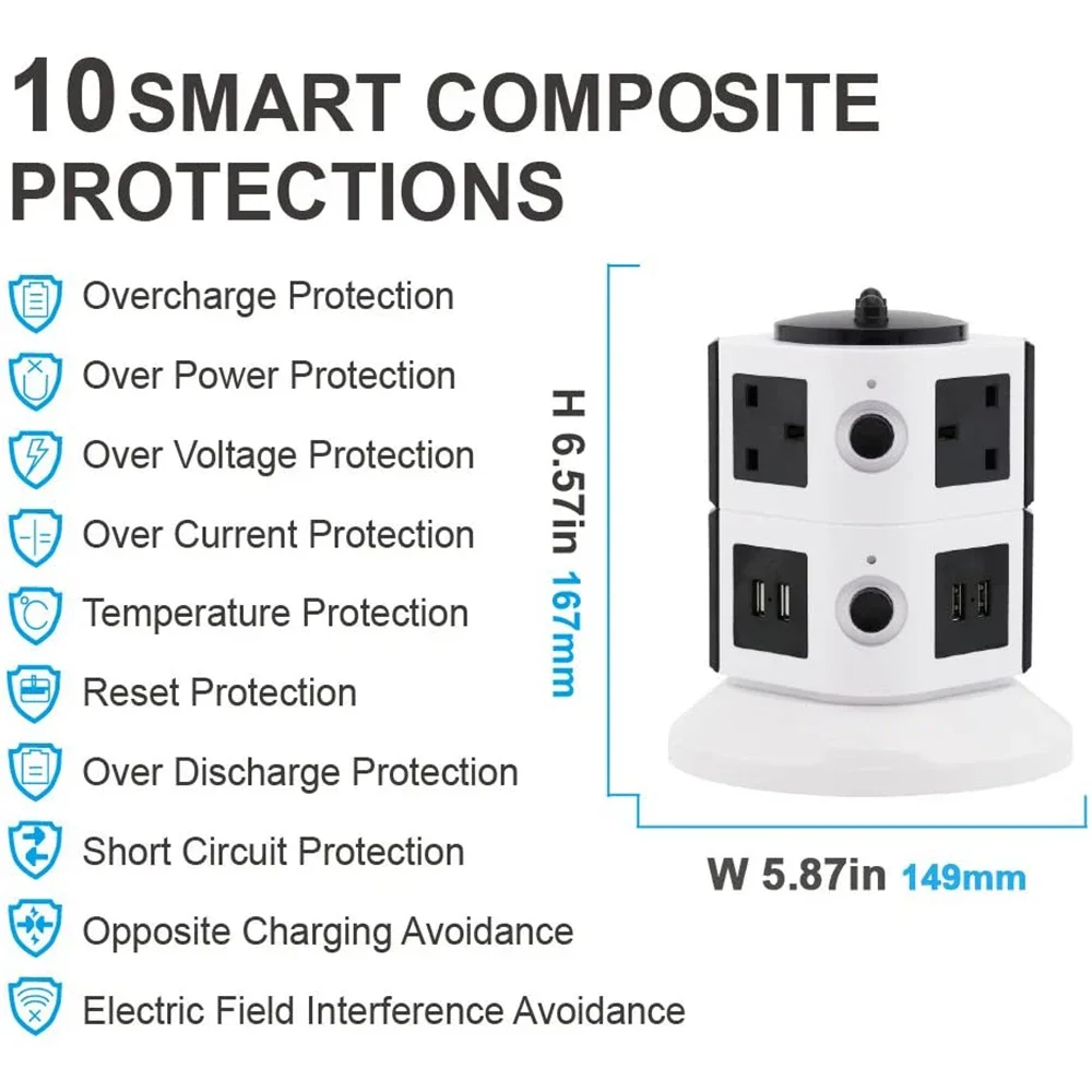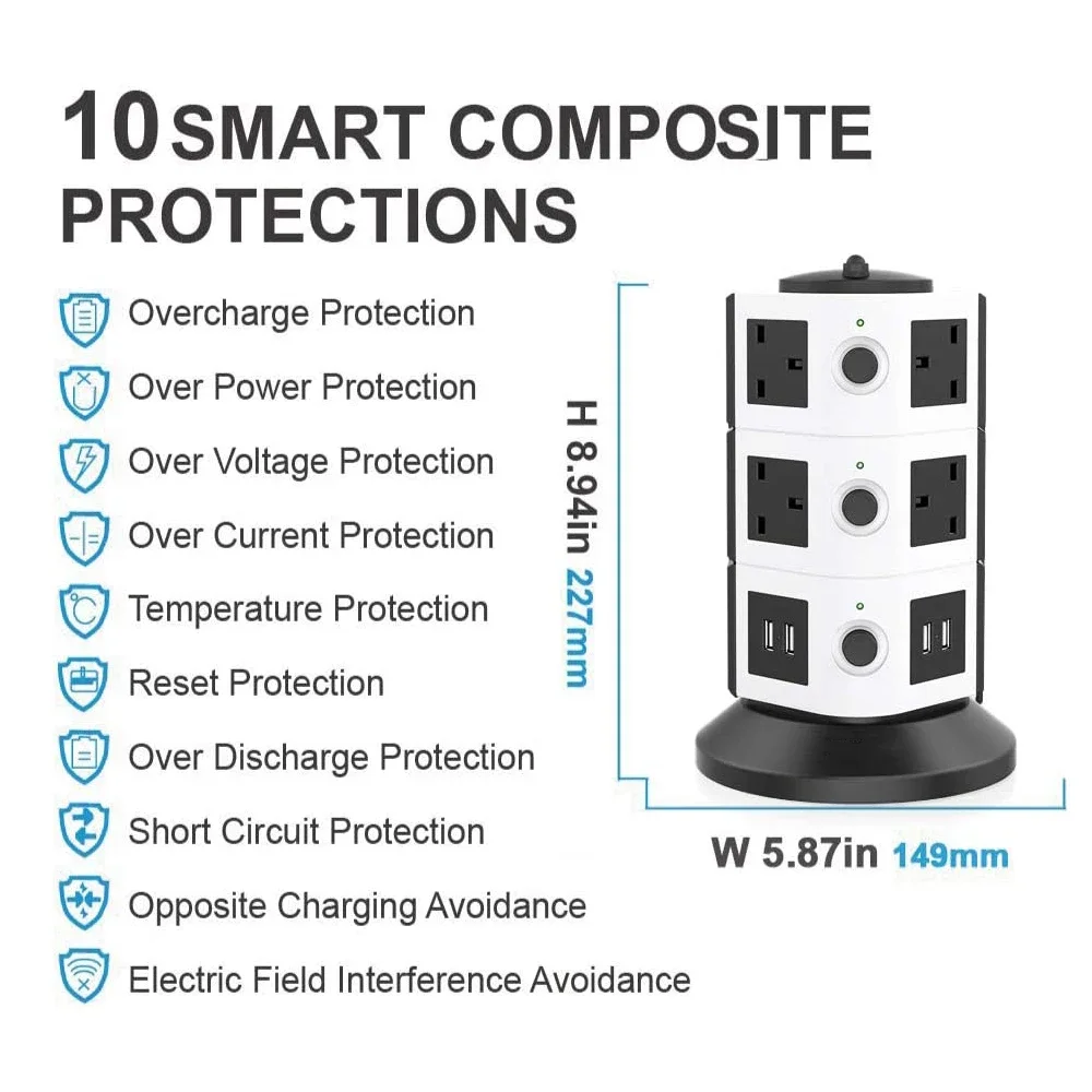 Tower Extension Lead Individually Switched Plug Socket 14 outlet and 4 USB Power Strip Multi Charging Station with Overload Protection,2M Cable-White and Black